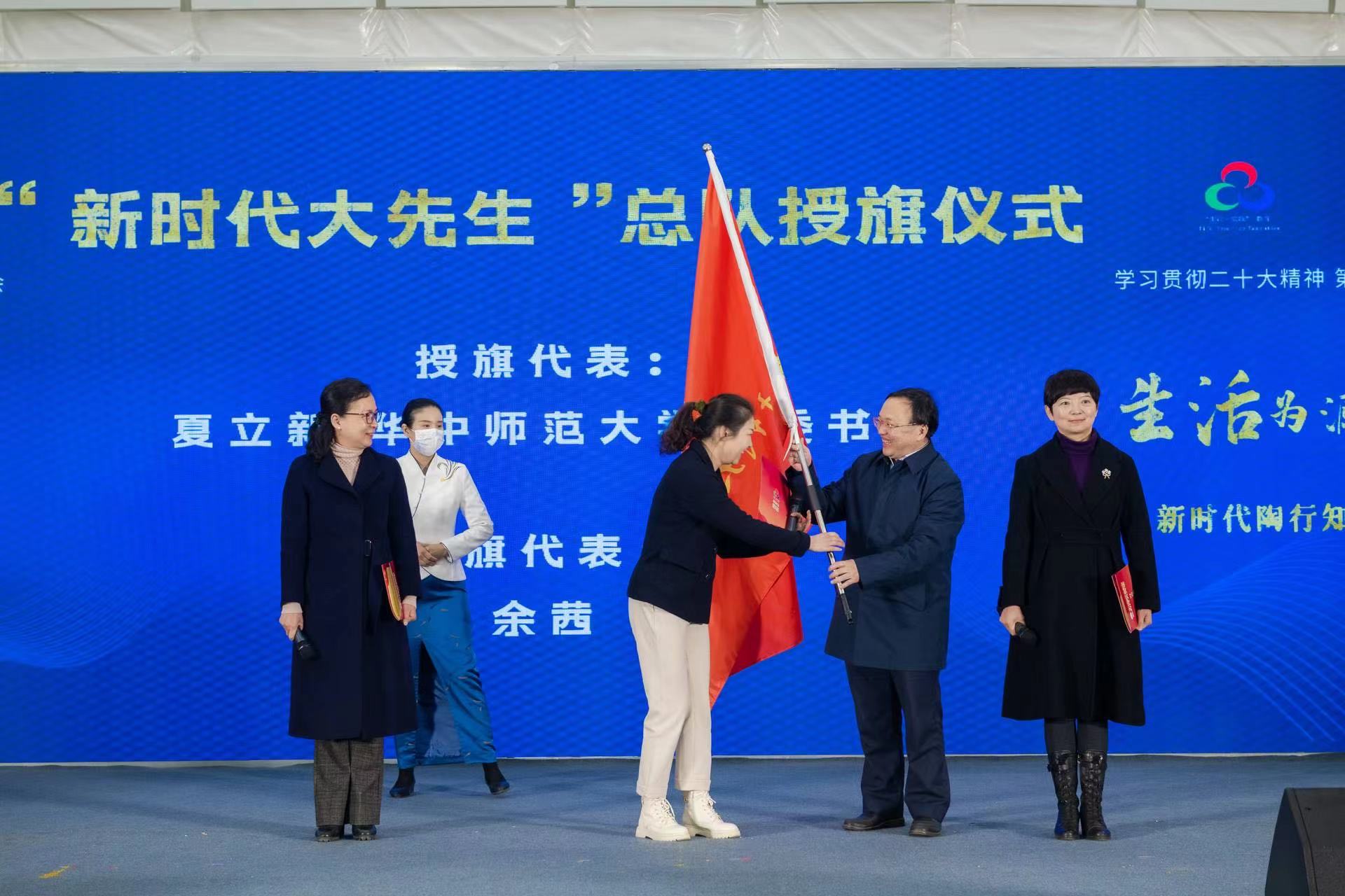 夏立新为“新时代大先生”总队代表——全国教书育人楷模马丹,荆楚好老师代表、武汉市育才小学余茜老师,荆楚好老师代表、我校心理学院田媛教授授旗