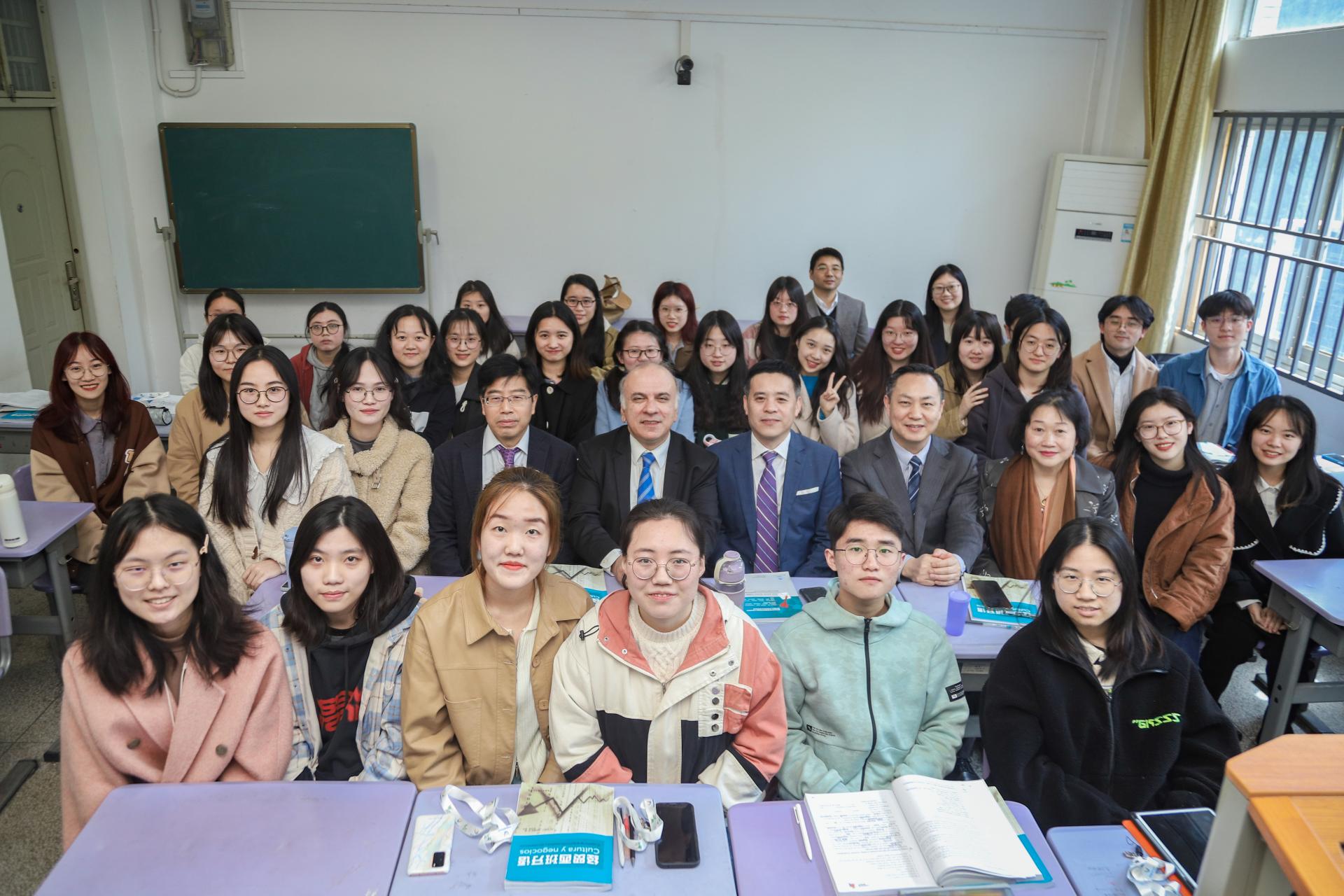 会见后,乌拉圭驻上海总领事一行走进外国语学院西班牙语课堂,马塞罗·马龙总领事为同学们介绍了乌拉圭的风土人情和文化,与同学们展开了热烈交流。