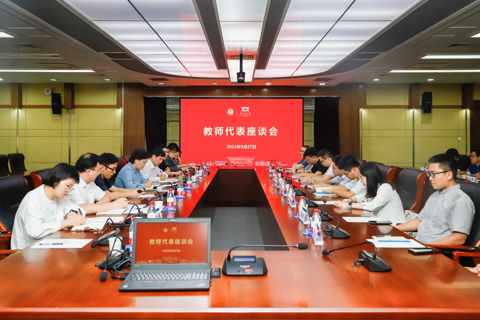 华大在线讯(记者 华轩)9月27日,教师代表座谈会在逸夫国际会议中心二楼举行。校长郝芳华、副校长任友洲与来自人工智能教育学部、教育学院、心理学院、文学院等16个学院的教师代表座谈交流,倾听教师心声,听取大家对学校发展建设的意见和建议。学校办公室、党委组织部、财务处、本科生院、研究生院、科技处、社科处、实验室与设备管理处、人事部等职能部门负责人参加座谈。座谈会由任友洲主持。