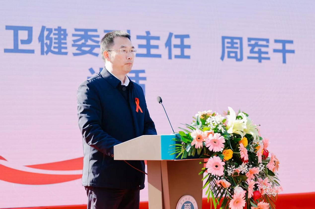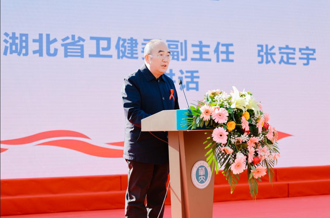 华大在线讯(见习记者 延语芊 杜俊晓)12月1日,以“凝聚社会力量,合力共抗艾滋”为主题的第36个“世界艾滋病日”宣传活动在博雅广场举行。湖北省教育厅,共青团湖北省委,湖北省、武汉市、洪山区卫健委、疾控中心,武汉市教育局,共青团武汉市委相关负责人出席。“人民英雄”、湖北省卫健委党组成员、副主任、公共卫生总师张定宇,武汉市卫健委副主任周军干,副校长李鸿飞参加活动并致辞。