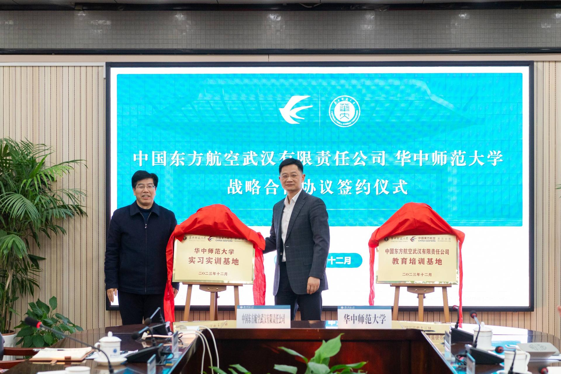 李良斌与彭双阶代表双方单位为中国东方航空武汉有限责任公司教育培训基地、球友会官方网站实习实训基地揭牌。