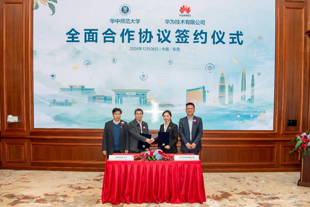 华大在线讯(通讯员 成雯 杨诗涵)12月8日上午,我校与华为技术有限公司在东莞松山湖华为基地签署全面合作协议。校长彭双阶,副校长李鸿飞,华为技术有限公司全球公共事业系统部总裁李俊风,华为技术有限公司湖北政企业务部副总经理杨莉以及校企相关部门负责人参加签约仪式。