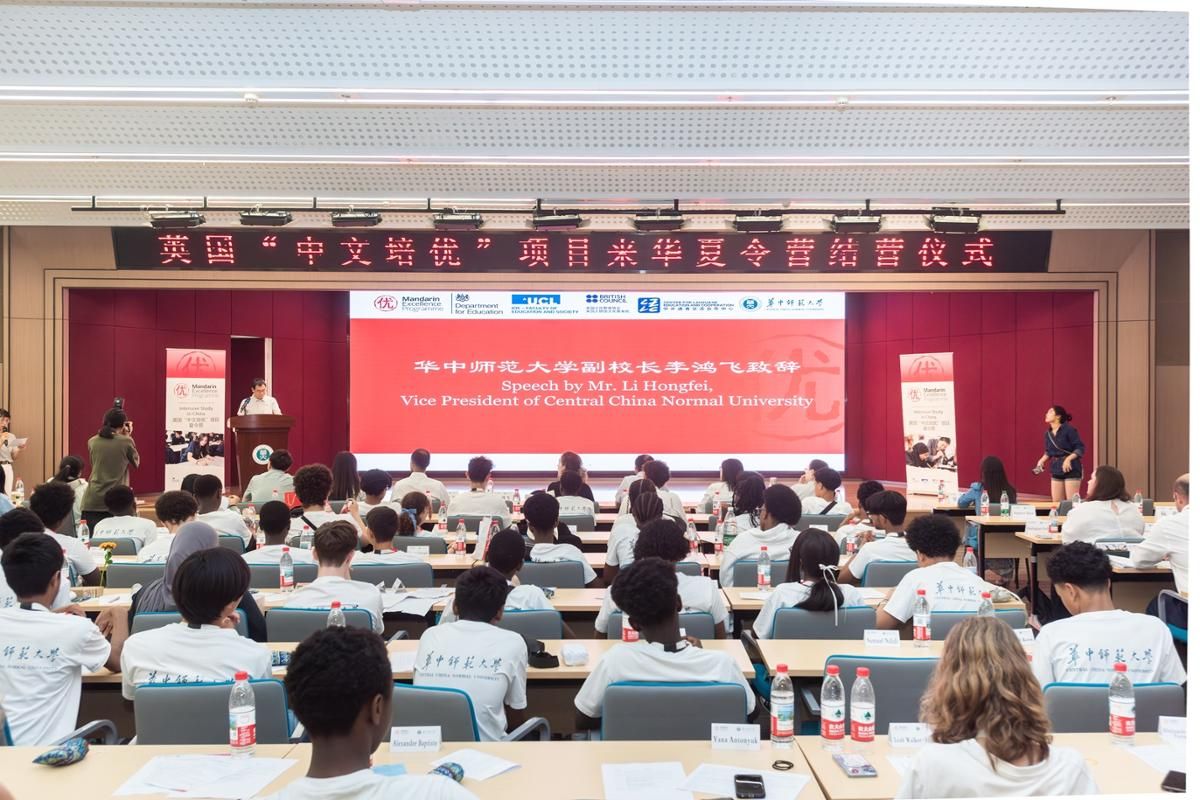 华大在线讯(通讯员 阮劭)7月14日,2025英国“中文培优”项目来华夏令营结营仪式在我校文科科研楼101报告厅举行。副校长李鸿飞出席并致辞,英国外交、联邦与发展办公室研究分析师艾米莉·里德尔,英国驻武汉总领事馆贸易投资领事诺安文、英国驻华大使馆文化教育处教育项目经理董李莹,湖北省教育厅、华师一附中等相关部门负责人,以及来自中英两国的师生、志愿者等共约120人参加了结营仪式。
