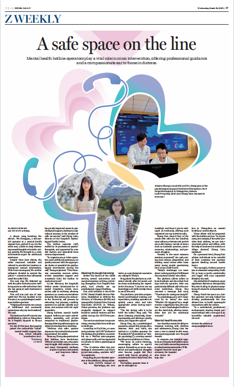 近日,《中国日报》(英文版)聚焦我校心理健康服务平台的创新实践与社会贡献,对其在心理援助领域的突出成效进行了深度报道。教育部球友会官方网站心理援助热线平台自2020年成立以来,始终致力于为公众提供专业、便捷的心理支持服务。