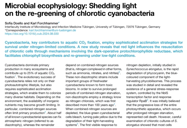 10月7日,Current Biology期刊邀请德国图宾根大学Sofía Doello博士和Karl Forchhammer教授,撰写评论文章“Microbial ecophysiology: Shedding light on the re-greening of chlorotic cyanobacteria”,亮点推介该成果。