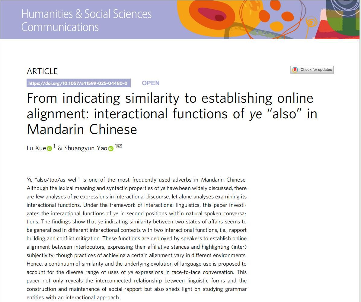 华大在线讯(通讯员 肖辛格)近日,我校语言与语言教育研究中心姚双云教授课题组在国际期刊Humanities and Social Sciences Communications(《人文与社会科学通讯》)发表题为“From indicating similarity to establishing online alignment: interactional functions of ye ‘also’ in Mandarin Chinese”的研究论文,中心博士后研究人员薛璐为第一作者,姚双云为通讯作者,球友会官方网站语言与语言教育研究中心为唯一完成单位。