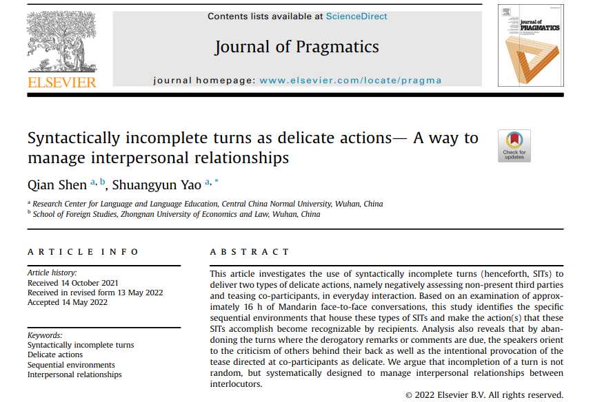 华大在线讯(通讯员 龚睿)近日,语言与语言教育研究中心姚双云教授及其团队在汉语口语语法研究中取得新的进展,在语用学国际知名期刊Journal of Pragmatics第197期上发表题为“Syntactically incomplete turns as delicate actions— A way to manage interpersonal relationships”的研究论文。该文为我校博士生沈谦和导师姚双云教授合作发表,是国家社科基金重点项目的阶段性成果,也是该团队第二次在该刊物发表重要成果。